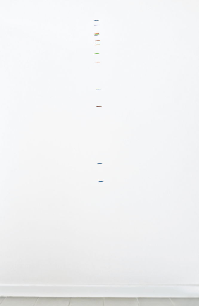 it / Lo spazio, e la sua suddivisione, ricopre il ruolo centrale all’interno di quest’opera a parete. Family Portrait è un ritratto dinamico iniziato nel 2014 e in corso ancora oggi, che cambierà nel tempo perchè basato su un valore oggettivo ma variabile, ovvero la statura delle persone ritratte. Utilizzando un metodo popolare, diffuso per misurare la crescita dei bambini, l’artista traccia il ritratto della propria famiglia. Genitori, sorelle e nipoti sono stati invitati a misurarsi e scegliere un loro colore rappresentativo. Il risultato è un’istanstanea del momento. Quattrodici segni colorati, diventano materia non tangibile ma anche il modo per evocare legami e ricordi dell’esistenza.