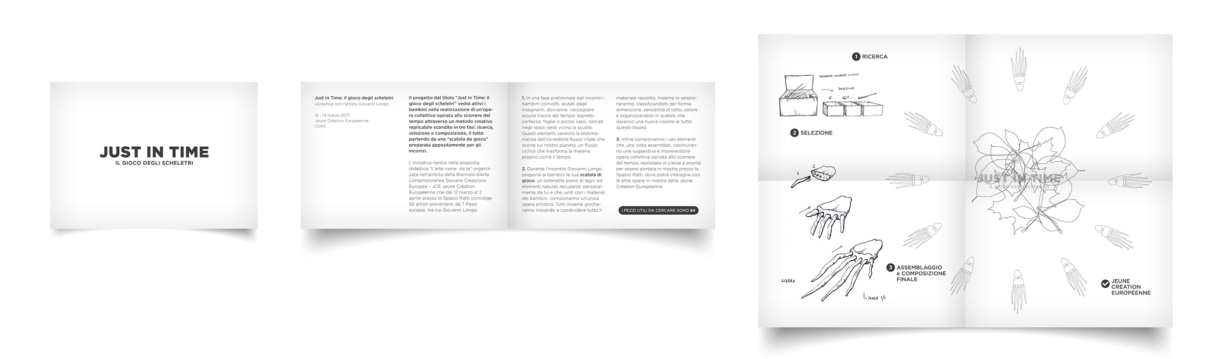 Il progetto dal titolo “Just in Time: il gioco degli scheletri” ha visto attivi oltre 100 bambini nella realizzazione di un’opera collettiva ispirata allo scorrere del tempo attraverso un metodo creativo replicabile scandito in tre fasi: ricerca, selezione e composizione, il tutto partendo da una “scatola da gioco” preparata appositamente per gli incontri.