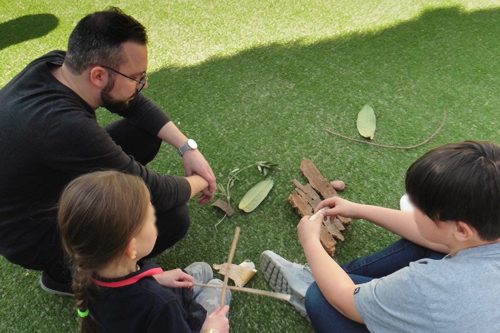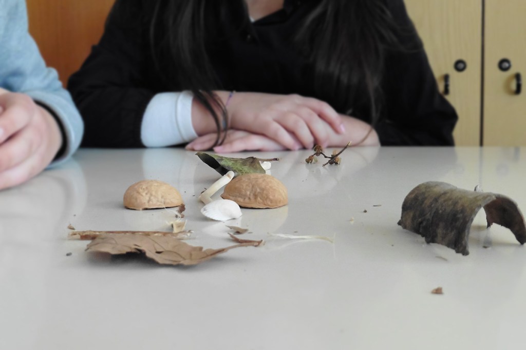 1. In una fase preliminare agli incontri i bambini coinvolti, aiutati dagli insegnanti, hanno raccolto alcune tracce del tempo: legnetti, cortecce, foglie o piccoli sassi, cercati negli spazi verdi vicino la scuola. Questi elementi sono la testimonianza dell’incredibile flusso vitale che scorre sul nostro pianeta, un flusso ciclico che trasforma la materia proprio come il tempo.
